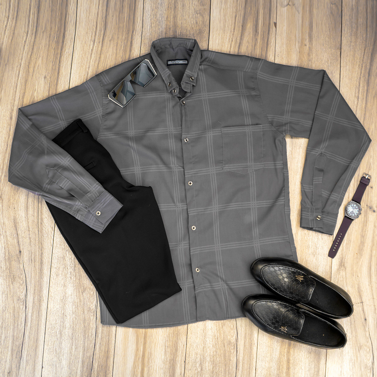 پیراهن مردانه چهارخونه طوسی مدل Ravin